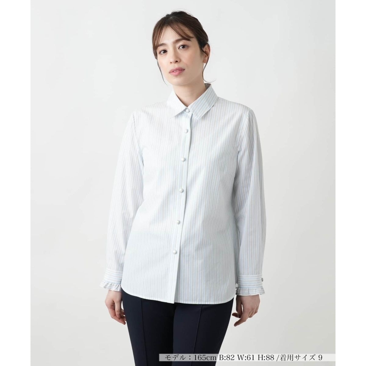 オルタネイトストライプがうっすらと浮かぶブラウス。コットンにセルロースをブレンドした薄手の生地を用い、軽やかで通気性がよく、爽やかな着心地を実現しています。パール調ビジューのデコラティブなボタンを採用し、さりげない華やかさをプラス。襟元や袖口の細部までこだわりが詰め込まれ、上品でエレガントな印象を与えます。パンツと合わせてスタイリッシュなオフィスコーデに仕上げたり、スカートと合わせてフェミニンなスタイリングを楽しんだりと、幅広い着こなしに対応する一枚です。