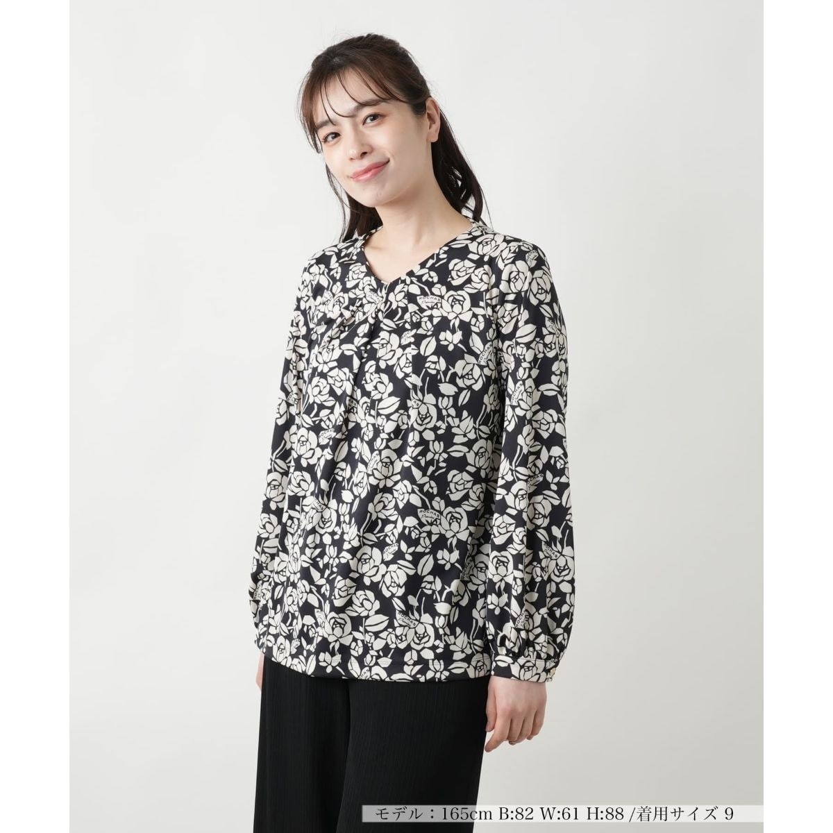 幾何学的なフラワーモチーフとロゴのコンビネーションが冴える、モダンなデザインのブラウス。ネックラインは程よく開きを持たせ、女性らしい抜け感を演出。巧妙に施されたタックが立体的なシルエットを作り出し、余裕を感じさせるエレガントな着こなしが完成します。ワイドパンツと合わせてリラックス感のある大人カジュアルに、スカートでまとめればフェミニンなスタイルにも仕上がり、幅広いコーディネートで活躍する一枚です。カフス部分、バックネックの涙あきはボタン開閉が可能。