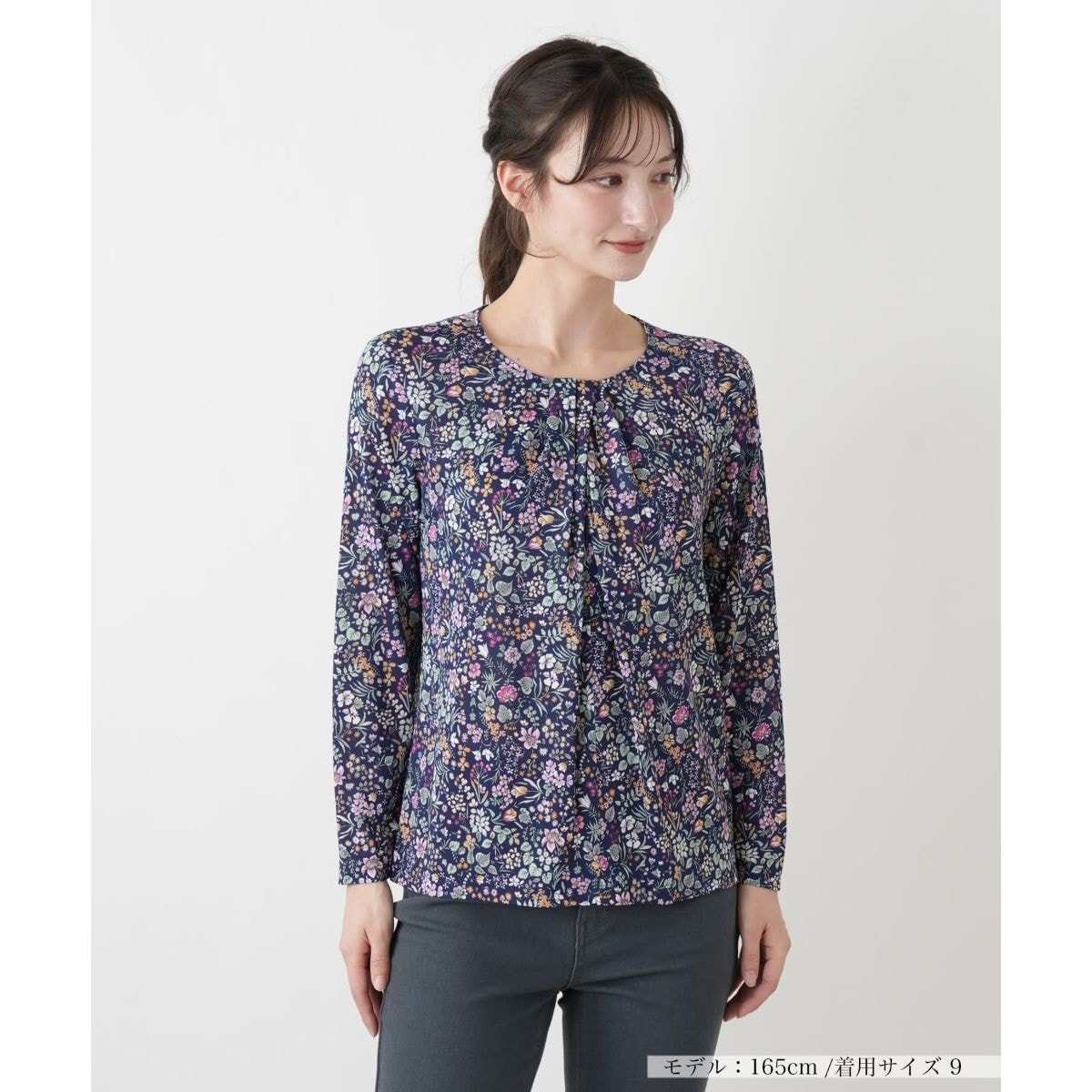 「BINDA」のクルーネックカットソーは、初夏の装いを華やかに彩る一枚です。落ち着いた地に繊細な花々を散りばめ、大人らしい気品ある表情を演出します。襟元に施されたタックが胸元に立体感を生み出し、シルエットを美しく整える仕立て。伸縮性に優れたやや薄手の素材は肌当たりが良く、軽やかな七分袖で涼やかな着心地を叶えます。背面のボタンループ仕様が後ろ姿のアクセントになり、スムーズな着脱も可能なデザイン性の高いアイテムです。