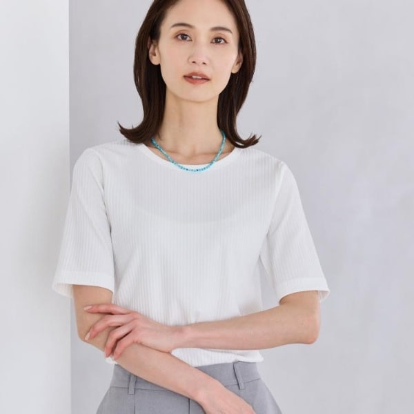 ストレッチが効いたリブ編み素材を使用した快適な着心地の半袖トップス。