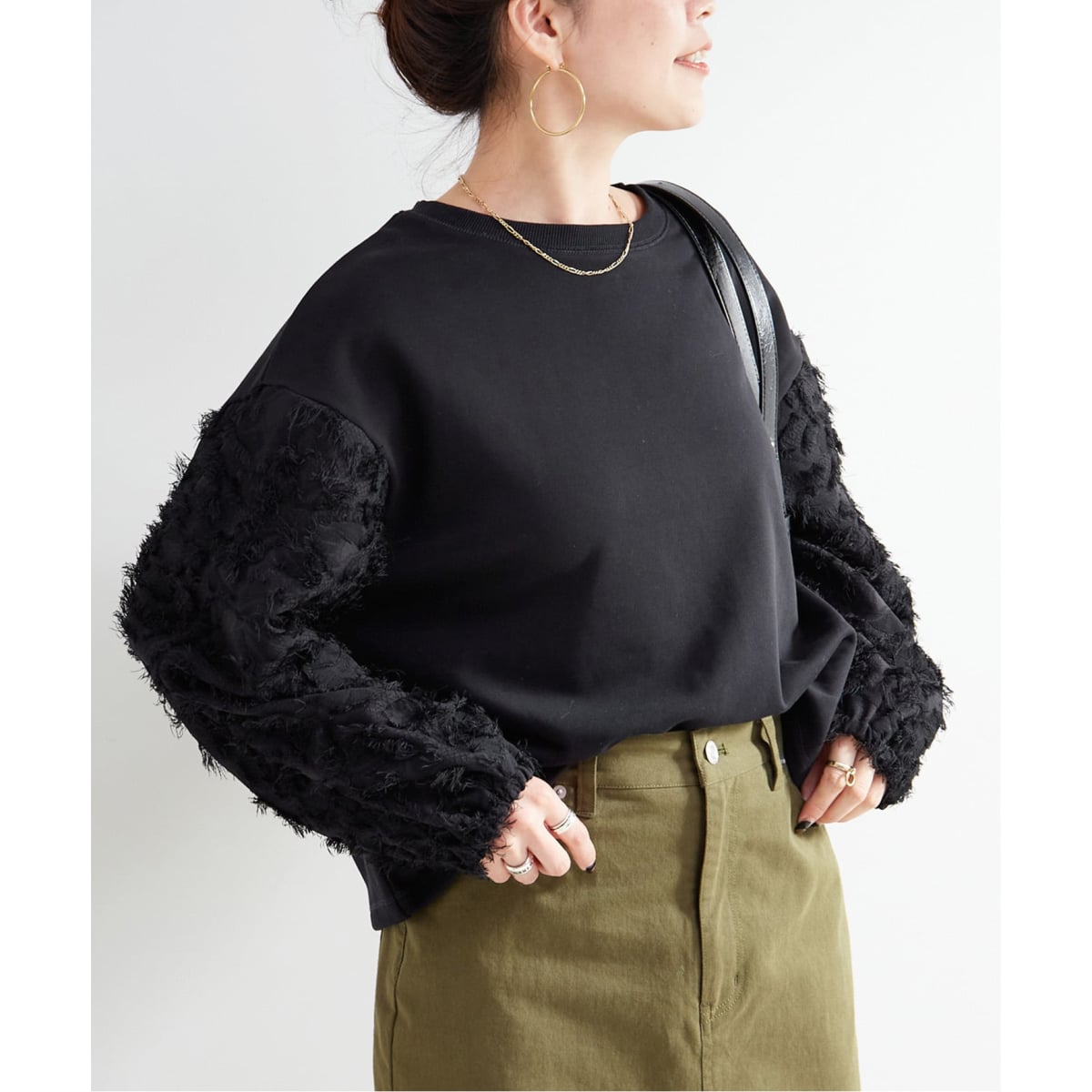 ボディ部分はカジュアルな裏毛素材でリラックス感のある着心地に仕上げ、袖部分はジャガード素材で丸みのあるパフスリーブを組み合わせています。スッキリとしたクルーネックにワイドなシルエット、ジャスト丈でバランスよく着こなせる一枚。
