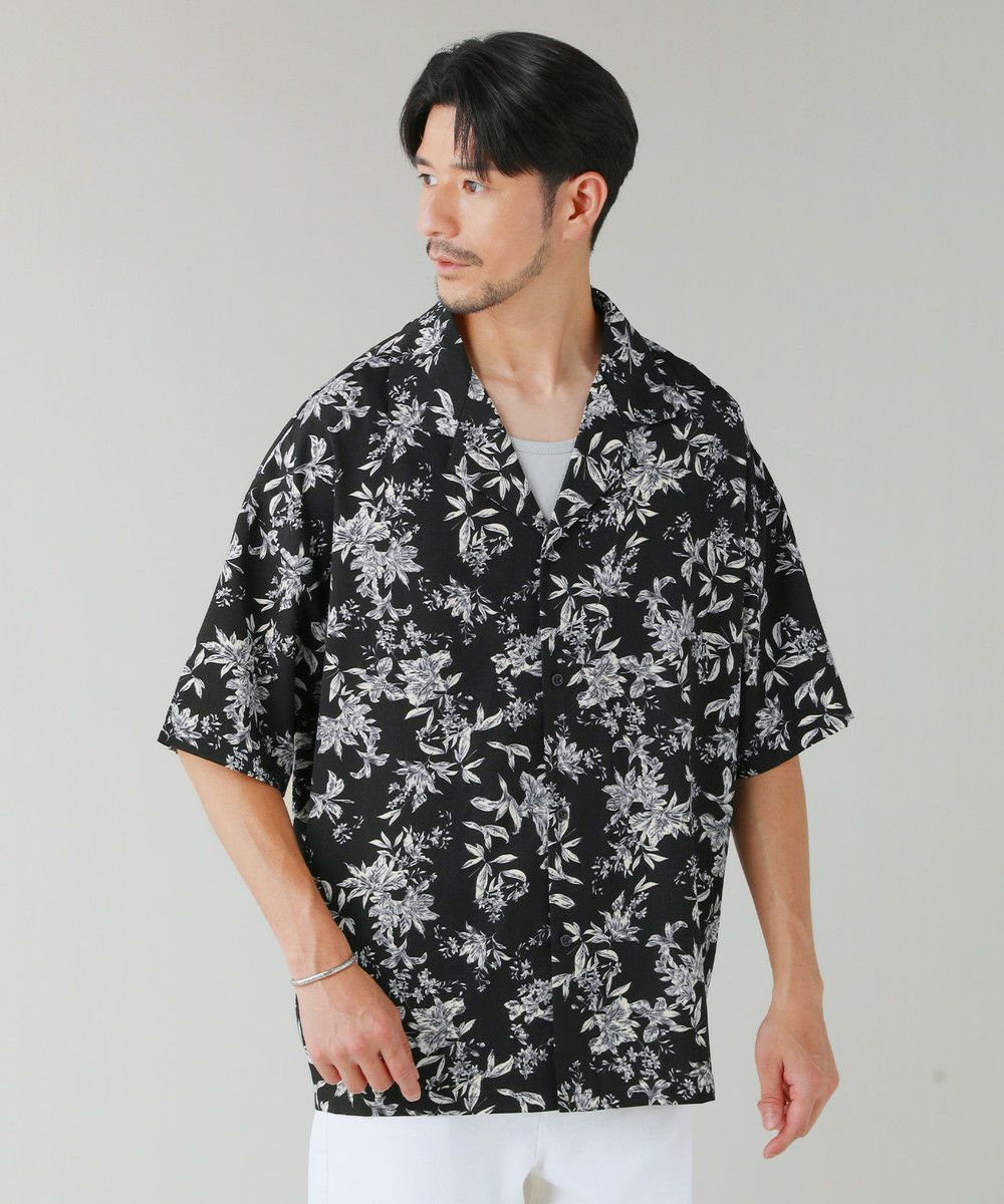 フラワー柄プリントブロードオープンカラー半袖シャツ