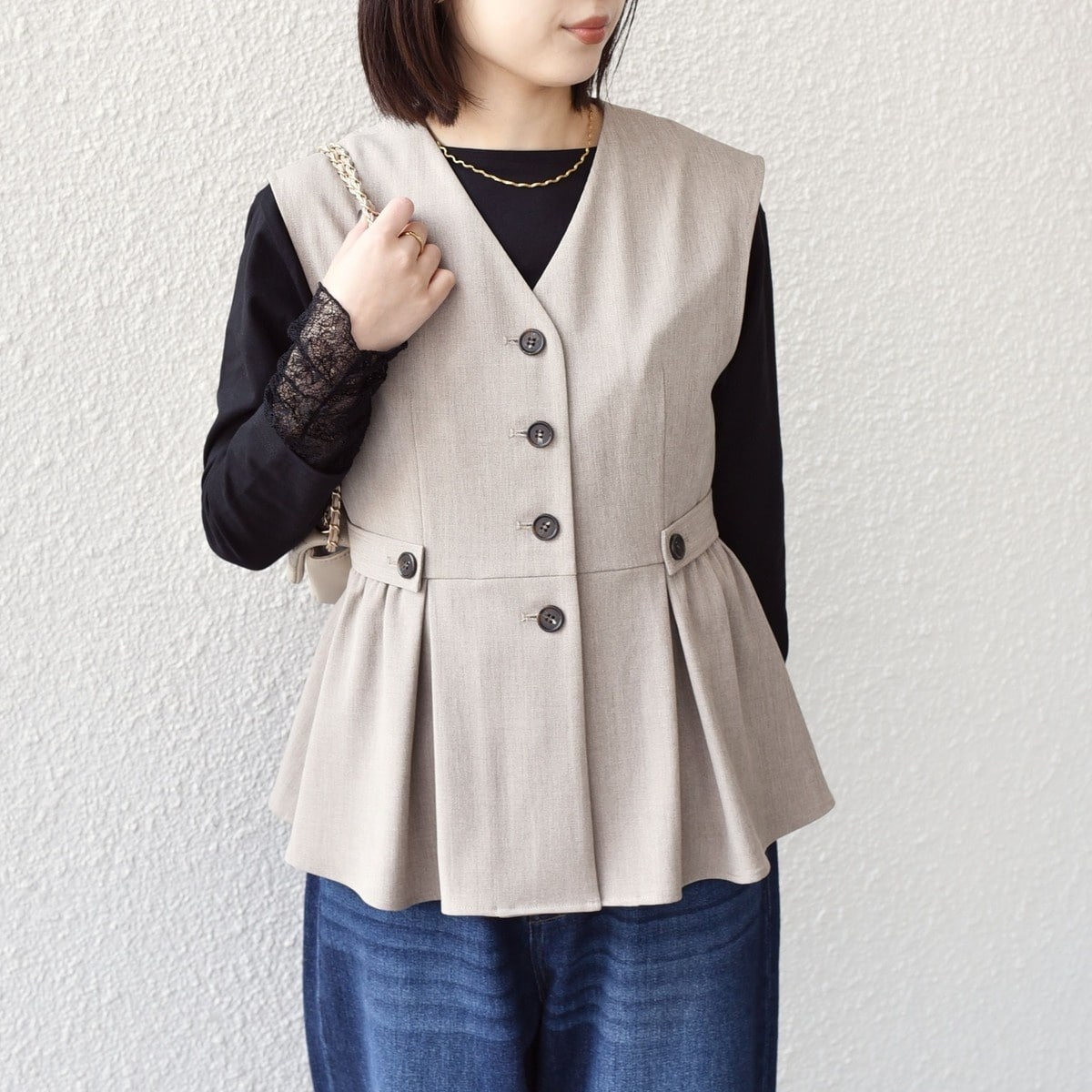 こなれた印象を引き立てるペプラムベスト。