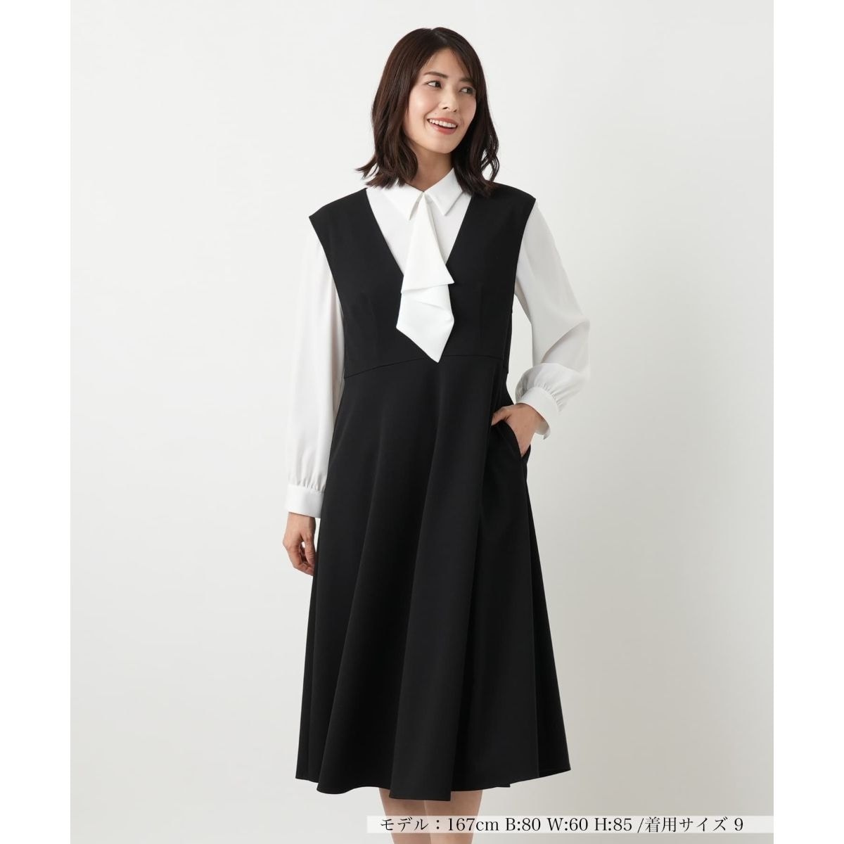 上半身はコンパクトに、裾に向かって優雅に広がるフレアシルエットが美しいジャンパースカートです。適度なハリ感があるため、体のラインを拾いすぎず、常に美しいシルエットを保ちます。また、ストレッチ性も高く、エレガントな見た目ながら快適な着心地です。合わせるインナー次第で、オフィスカジュアルからお出かけまで、幅広い場面で活躍する着回し力の高い一着です。