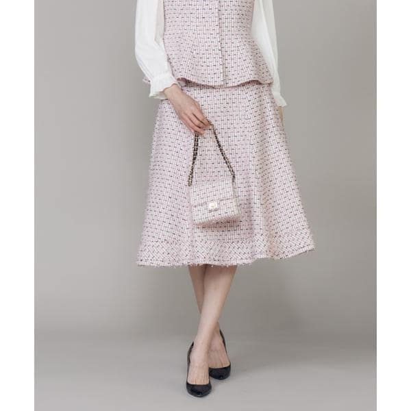 ■デザインタテ糸・ヨコ糸合わせて6種類もの糸を使用し、フリンジヤーンを織り交ぜることで華やかで奥行きのある表情を生み出した、特別なファンシーツイードのスカート。細部まで計算し尽くされた華やかなピンクカラーは、他にはない表情と高級感を備えた生地に仕上がっています。裾には上下にフリンジ加工を施した共地のテープを配し、同素材のジレとセットで着用するとより華やかな印象に。ウエスト下に入った縦の切り替えが上品なシルエットを演出し、足をすっきり見せる丈68cmのスカートとして、美しくスタイルアップして見える一着です。■素材タテ・ヨコに6種類もの糸を使用した、表情豊かなファンシーツイード素材。中には複数の糸を組み合わせて1本に仕上げた糸もあり、同じ糸でも色味に変化を持たせることで、奥行きのある豊かな表情を演出。織り組織もあえて複雑に設計し、それぞれの糸が主張しすぎないよう細部まで緻密に計算された、こだわりのファブリックです。・ポケットあり・裏地あり・左サイドファスナーあり・ウエスト後ろ部分ゴム仕様同素材のジレ品番:5160141503■サンプル撮影商品画像の商品はサンプルです。実際の商品とはサイズや色味、素材、デザイン等の仕様が若干変更になる場合がございます。■カラーについては、可能な限り実際の商品に近いカラーにて撮影をおこなっておりますが、照明の関係により実際の製品とは色味が違って見える場合があります。またパソコン・スマートフォンなどの環境により、若干製品と画像のカラーが異なる場合もございます。現物と画像のカラー差異については返品理由となりませんので、予めご了承ください。■サイズ表記はあくまで目安となります。
