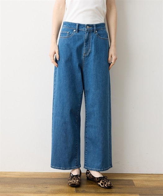 程よくハリのあるデニム素材で仕立てたワイドパンツ。