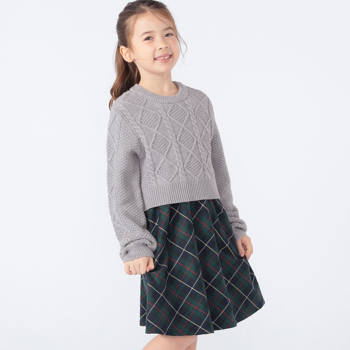 シンプルで上品なケーブルニットと秋冬のムードを高めてくれるチェックスカートを取り入れた、着るだけで気分の上がるアイテムです。