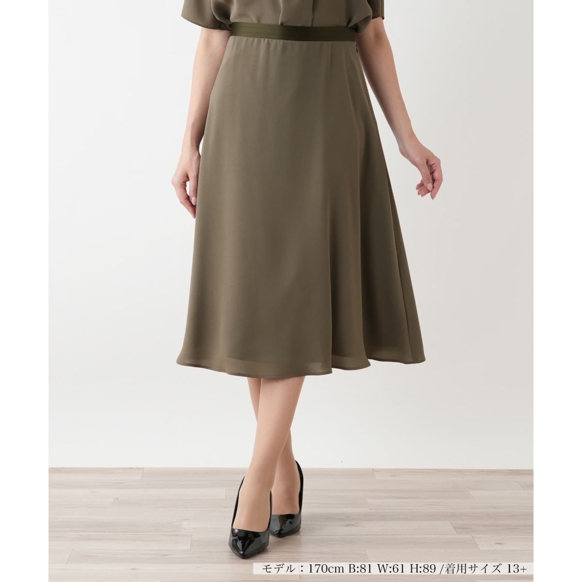 柔らかな光沢を湛えた、ミモレ丈のフレアスカート。上品な風合いの生地は、動くたびに柔らかなドレープを描きます。表地にはほどよい伸縮性があり、ストレスフリーなはき心地も魅力。きちんと感がありながら、軽やかさと女性らしさを兼ね備えた頼れる一枚です。セットアップ対応で統一感のあるスタイリングも楽しめます。サイドスナップボタン、ホック&ファスナーにより開閉が可能。