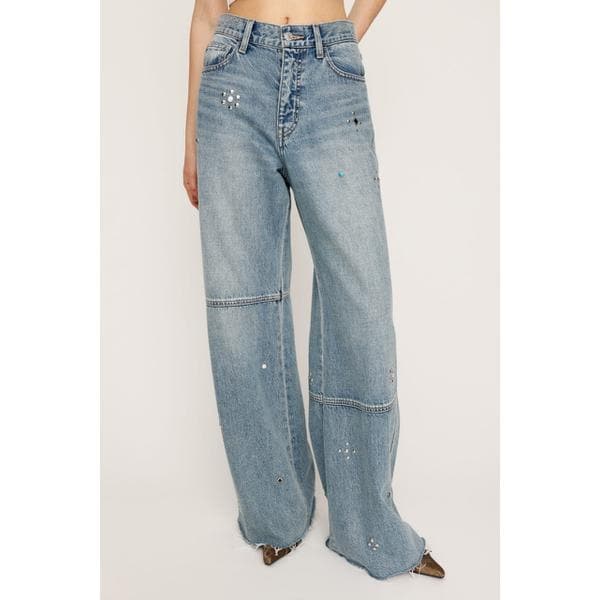 【STUDS SEAM DESIGN FLARE PT-B】■POINT:大胆にスタッズを散りばめた穿くだけでスタイリングの主役になれるフレアデニムが登場。■DETAIL:程よくワイドなフレアシルエットにヴィンテージ感のあるフェード加工を加えた事で立体的で深みのあるブルーに仕上げました。様々なサイズのメタルスタッズとパールスタッズを施した事で、穿くだけで目を引き、コーディネートを際立たせてくれます。■STYLING:スタッズなどエッジの効いたパーツを使用しているため、女性らしい柔らかなシャツやブラウスとの相性も良いです。またデニムオンデニムでも楽しめるよう、同シリーズでビスチェ(030IAY10-0991/STUDS DENIM BUSTIER-B)の展開もあります。■FABRIC/MATERIAL:コットン100%のデニム地を使用。■透け感:なし■光沢感:なし■伸縮性:なし■裏 地:なし本品は、素材特性上以下の点にご注意ください。・着用や洗濯につれ退色し、独特な色変化が生じます。・雨や汗等の湿った状態、着用や洗濯、クリーニングによって他の衣類、雑貨、家具等に色落ちします。・白・淡色との組み合わせは避けて下さい。・淡色は光(紫外線)に弱いため変色する事があります。直射日光や蛍光灯の光に長時間さらさないようご注意下さい。・クラッシュやダメージ加工の製品は、着用や洗濯につれて加工箇所の広がりが生じる事がありますがご了承下さい。・着用や洗濯につれ多少の縮みやネジレ(製品がねじれて見える状態)が生じる事があります。・ボタンやリベットなどの金属部分を使用している場合は突起部分で人体や対象物にキズを負わせる恐れがありますのでご注意下さい。本品は裁ち切り始末にしています。着用や洗濯、クリーニングの繰り返しにより、ほつれが増したり、裁ち切り部分が丸まってくる事がありますので、ご了承下さい。ほつれが目立った際はほつれた糸を引っ張ったりせず、カットして下さい。 本品はファッション性を重視した非常にデリケートな装飾をしています。下記の点にご注意下さい。・着用(使用)や洗濯、クリーニング時に加わる物理作用により装飾の脱落、破損、光沢消失が生じる事があります。・装飾は引っ掛かり易く取れ易いので周りのものとの接触に十分にご注意下さい。・肌に触れ、刺激を感じ