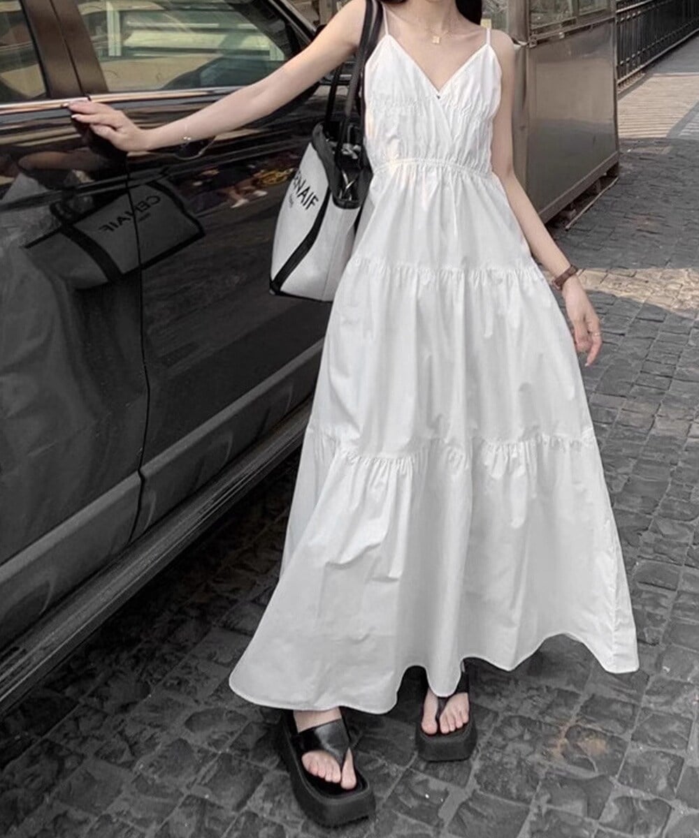 華奢なストラップとVネックが女性らしさを引き立てる。