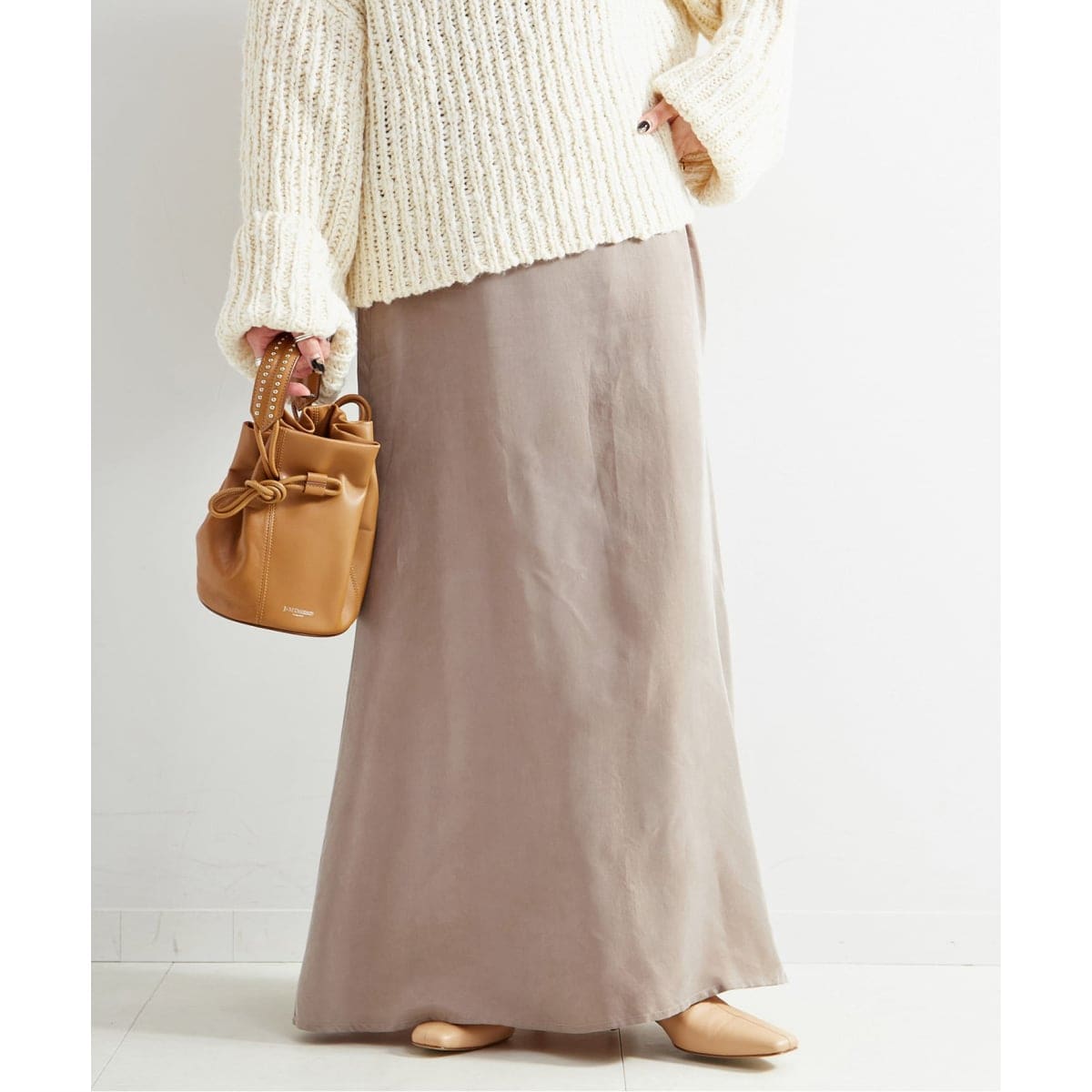 素材はシーズンレスで着用できる薄手のサテン生地で着回しが効き、一着持っていて間違いないアイテムです。ウエスト周りは程よいフィット感で、リラックスして穿いて頂けます。シルエットは緩やかなカーブから裾にかけて少し広がりがあるフレアで、歩くたびに女性らしい雰囲気が出るマーメイドシルエットになっています。