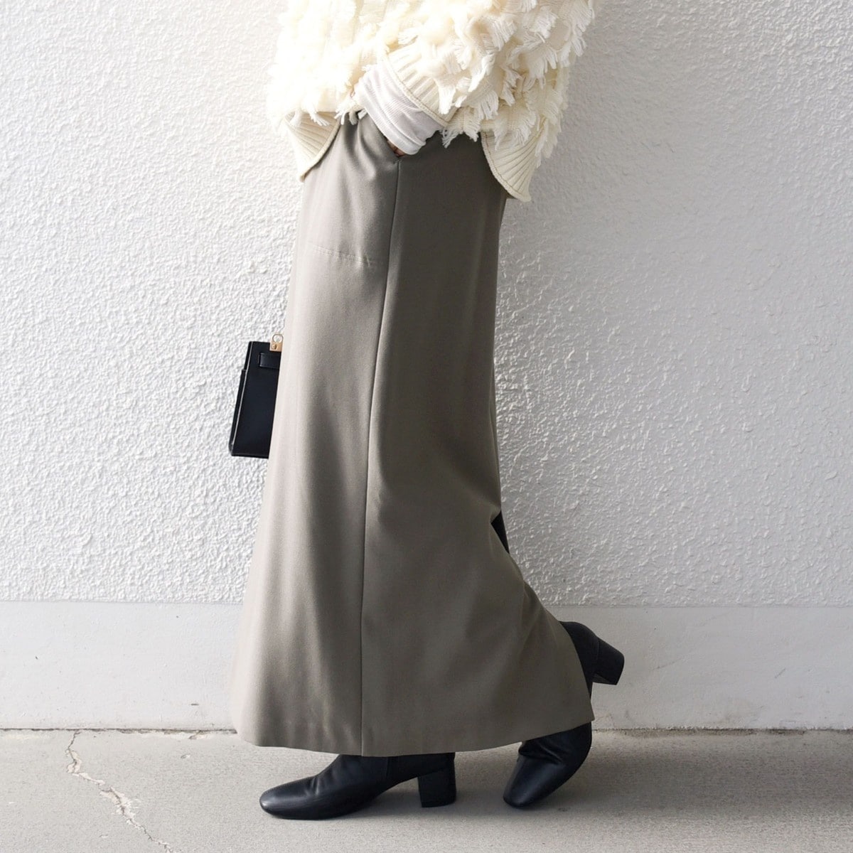 すっきりとしたIラインシルエットなので、ボリュームのあるトップスとも好相性。