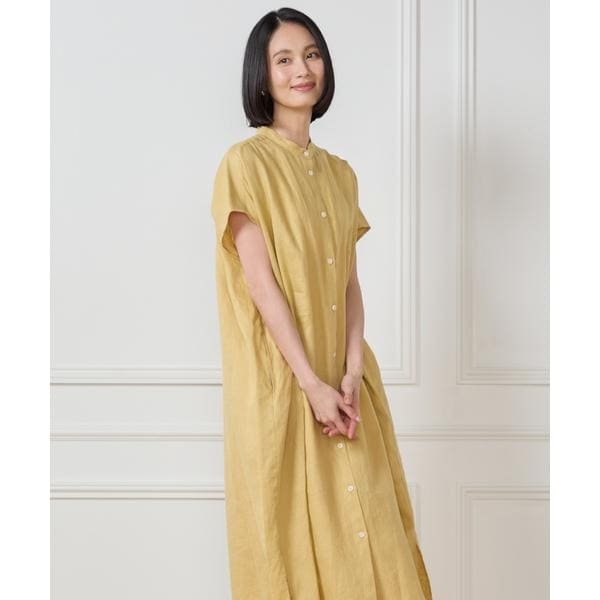 涼しげなフレンチスリーブのシャツワンピース。気になる二の腕をカバーする袖のカッティングに拘りました。華奢なバンドカラーやシンプルなディテールでリラックス感がありつつクリーンでクリアなイメージのワンピースに仕上げています。見頃はゆったりとしたシルエットでストレスフリーな着心地を叶えました。麻特有のさらりとしたドライな素材感と軽やかさが季節感漂う一枚です。パンツを合わせてジレ風の着こなしもできる丈感もポイントです。・裏地なし・ポケットあり・ペチコート付き・水洗い可
