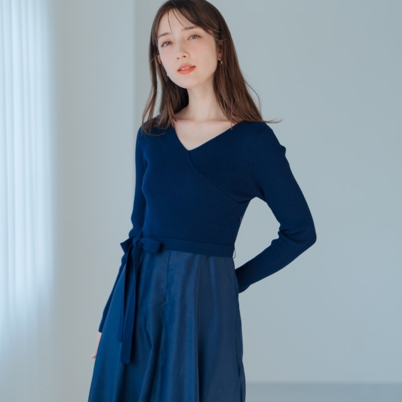 異素材使いのドッキングデザインがエレガントなカシュクールワンピース。トップス部分はリブ素材で心地よくフィットし、シルエットもすっきりとした印象に。スカートは上品な光沢感と豊かに広がるフレアシルエットが華やかさを演出してくれます。ウエストリボンでアクセントをプラスし、女性らしい美スタイルに決まるアイテムです。■fabric透け感[無し]裏地[一部有り]伸縮性[一部有り]生地の厚さ[普通]ファスナー[有り]