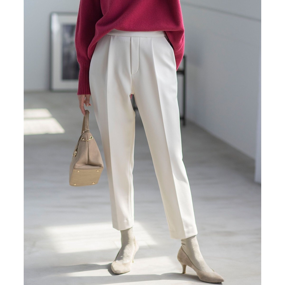 ■デザインややハイウエストですっきりとしたシルエットのテーパードクロップドパンツ。後ろがゴム仕様になっており、ハイウエストでありながら着心地にも配慮。ヒップから太ももあたりにかけては少しだけゆとりをもたせ、足首に向けてスッキリと細くなるシルエットと、表情感のある素材を使用することで少しだけシャープさを感じるように仕上げています。センタープレスが入ったメンズライクなムードはありながらも、上品で女性らしさを漂わせるパンツです。コンパクト系からボリュームトップスまでトップス選びに悩まないスタイリングしやすいシルエットも魅力です。