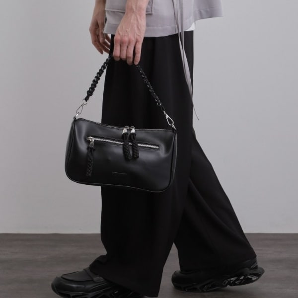 編み込みのショルダーストラップはブラック×MIX紐のモノトーンで仕上げ、シックで洗練された印象に。