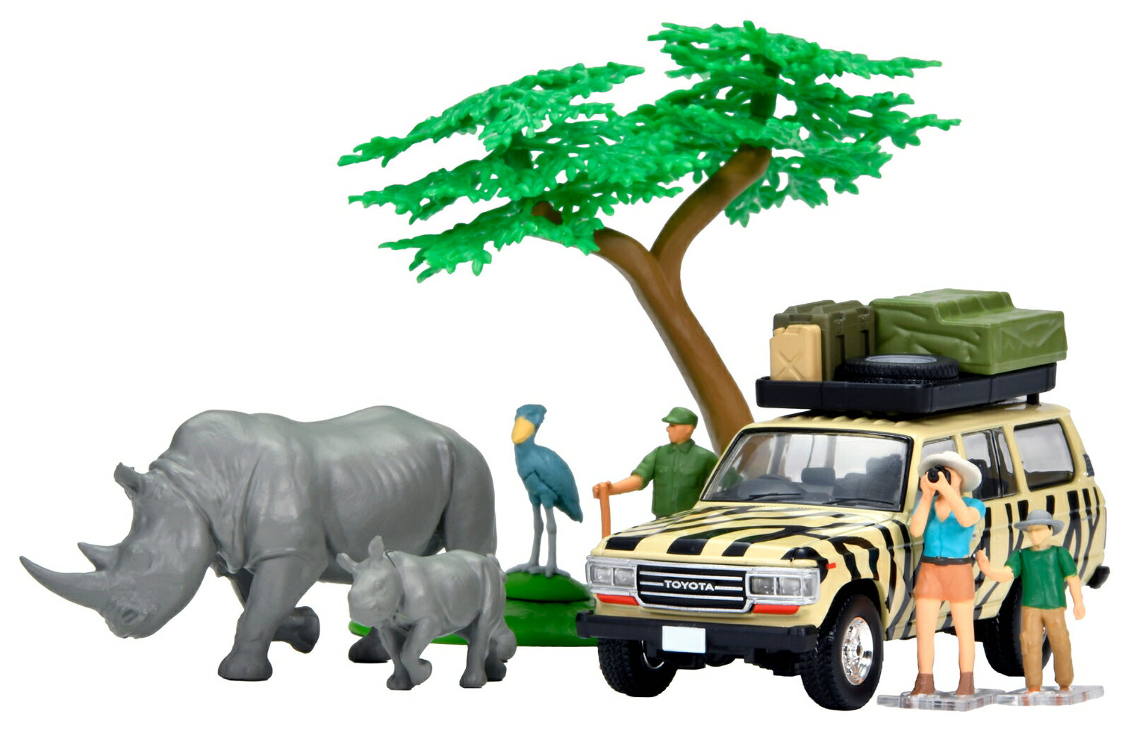 製品特徴SNSで盛り上がっている、ミニカーやトイを使った「映え」写真。単に撮影するだけでなく、フィギュアや情景アイテムと組み合わせるなど、いろいろな工夫を楽しむ人たちが増えています。そこでトミーテックが提案するのが、1/64スケールのジオコレ64 #カースナップです。今回はアフリカの「サファリ」をテーマとしたフィギュア・小物のセットです。トヨタ ランドクルーザー60のミニカーが専用カラーで付属します。海洋堂より生物造形の第一人者「松村しのぶ」氏が動物フィギュアを監修。生き生きとした動物たちが1/64スケールで登場します。力強いサイと羽毛が繊細なハシビロコウの造形は、我々をアフリカのサファリへと誘います。クルマとその周辺が映える写真をSNSに投稿して、#カースナップや#TLVを盛り上げましょう。製品仕様・1/64付属品・フィギュア【サイ(親)、サイ(仔)、ハシビロコウ、ツアーガイド、観光客(親)、観光客(子)】、収納ボックス、スペアタイヤ、ジェリカン、アカシアの木・ホビー系商品についての諸注意メーカー都合により発売の大幅な延期が発生する可能性がございます。予約商品についてはメーカーから順次入荷次第の発送となります。メーカー公表の発売日とは異なる場合がございますのでご了承ください。【対象年齢】:15歳以上