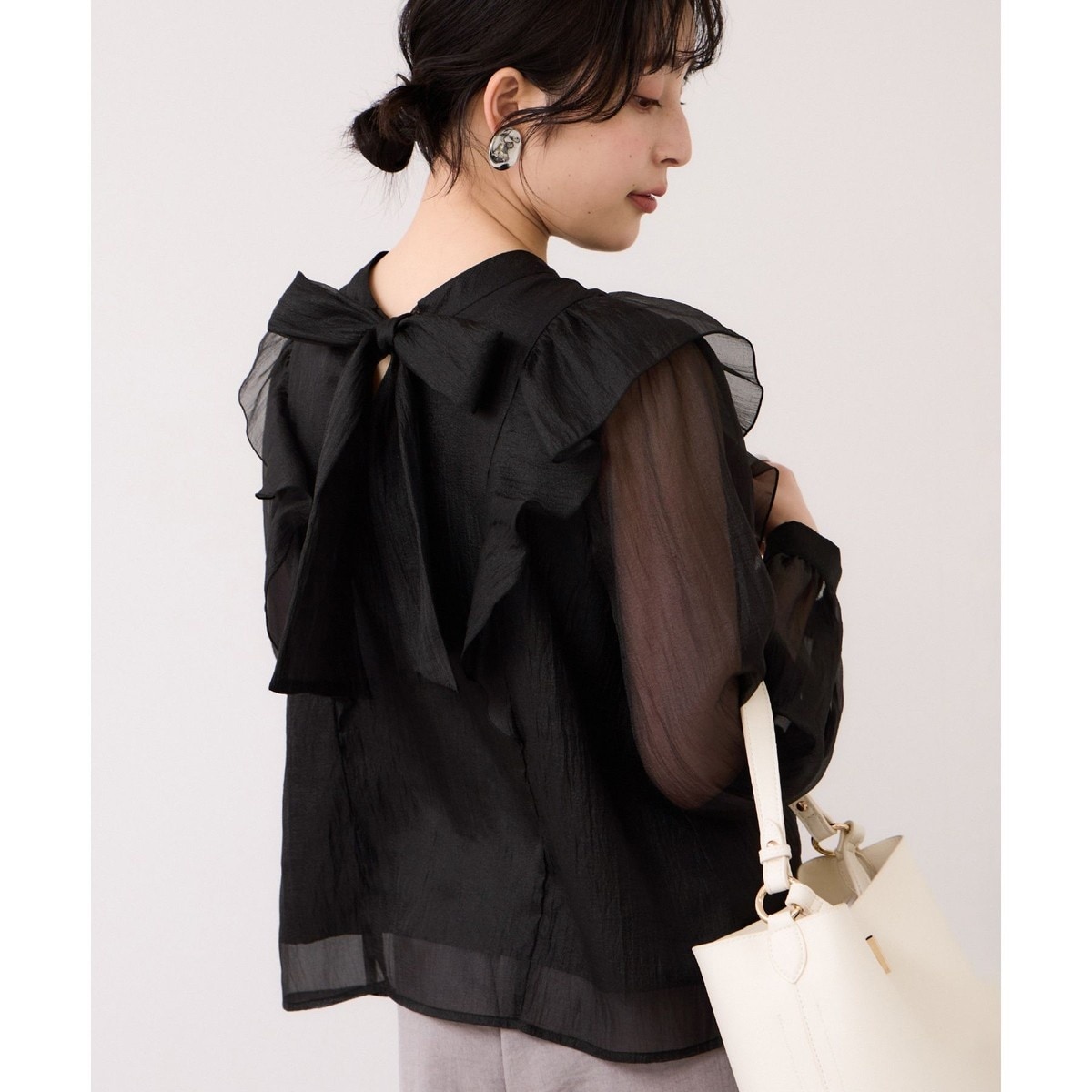 フリルにリボンとレディな要素をミックスさせた長袖ブラウス。身頃のみ裏地付きで袖のシアー感が細良い肌見せに。