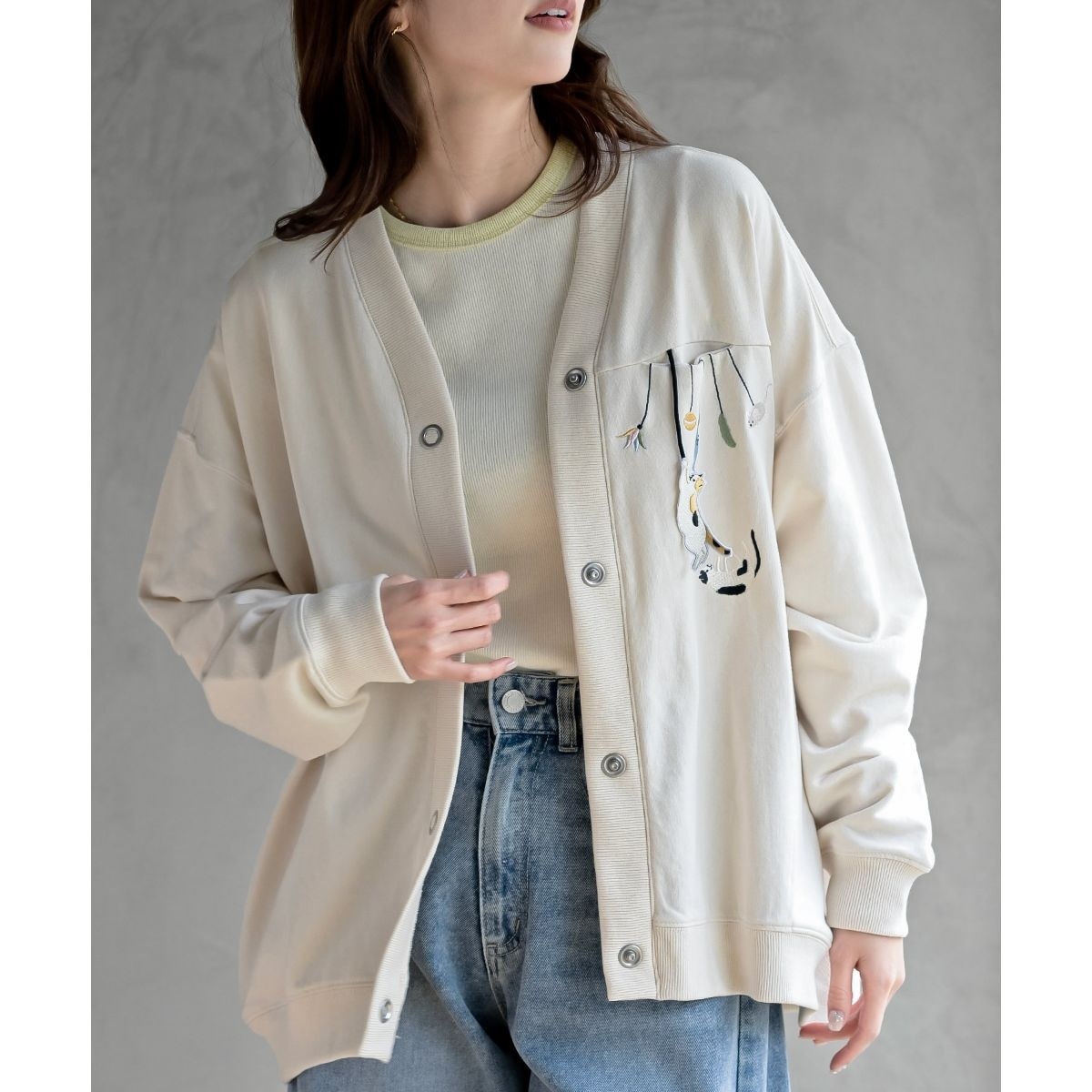 胸元で遊ぶ猫ちゃんがポイントのスウェットカーディガン。