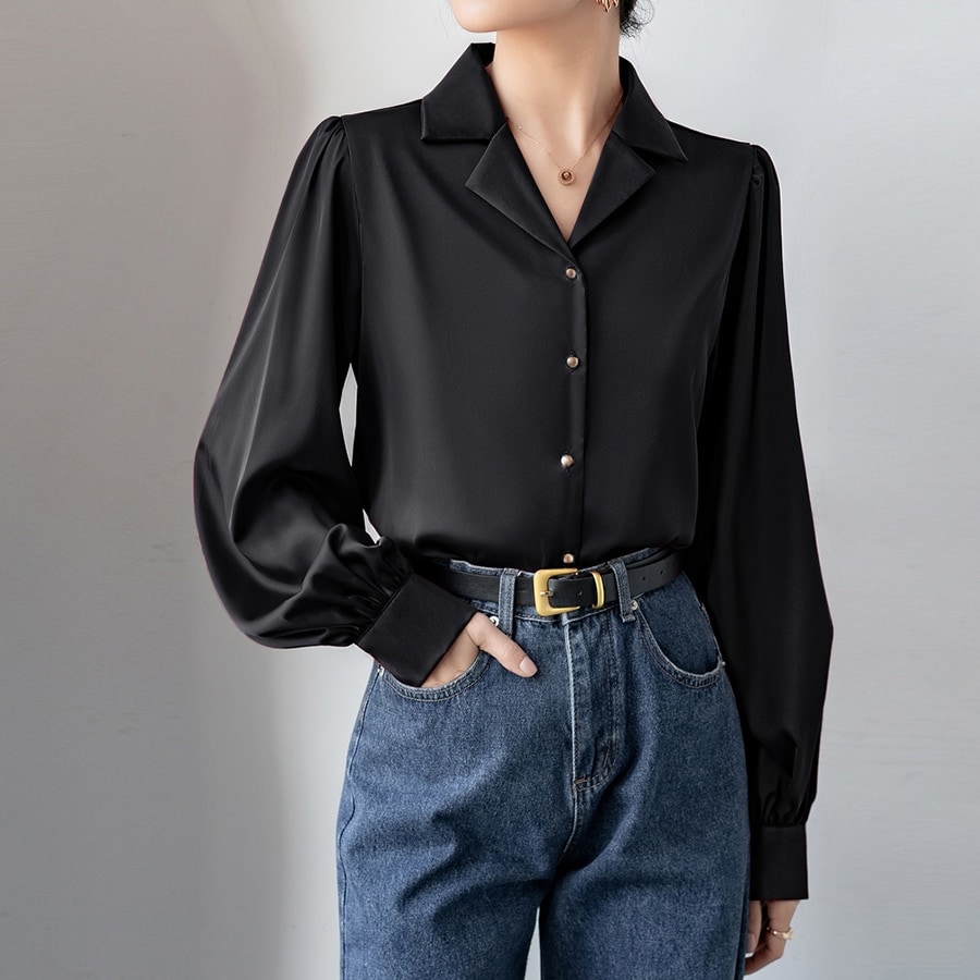 【トップス】 ブラウス シャツ ボリューム袖 ギャザー 羽織り レギュラーカラー ボタン 黒 白