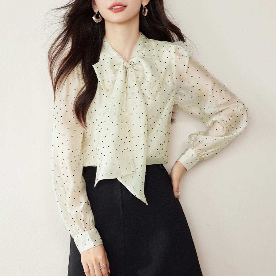 ドット柄×タイ付きブラウス