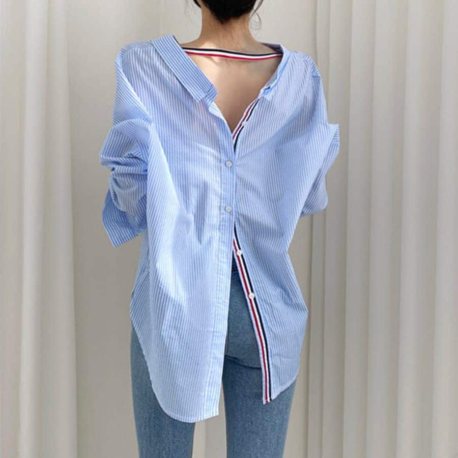 【新品】ストライプ長袖シャツ バックレースアップ 裾タックシャツ タグカット品