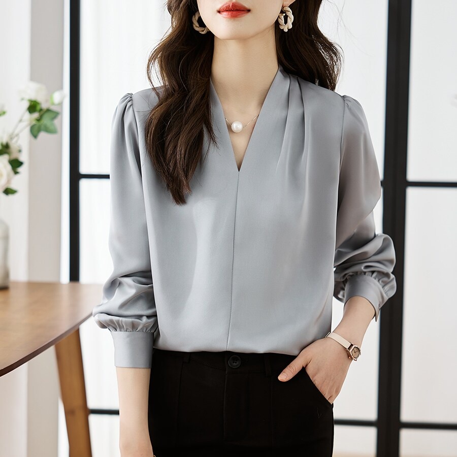 Another Edition/アナザーエディション【人気】白シャツ レディース 麻レーヨン混 ギャザー袖 Vネック 比翼風デザイン 長袖 ゆったり 美品