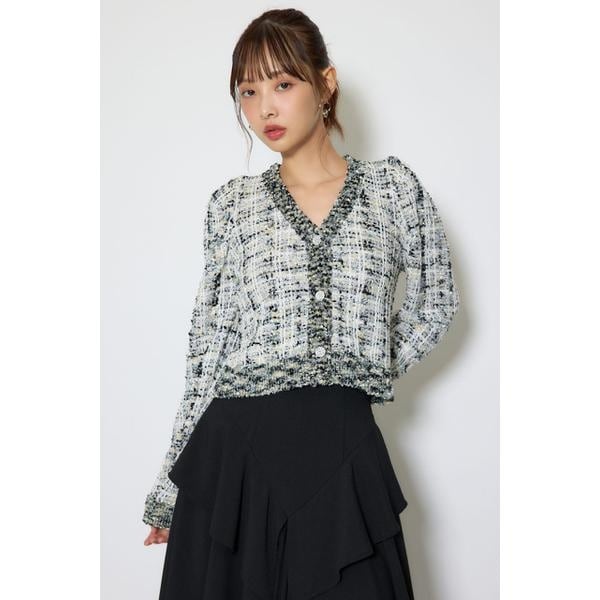 【毎年人気のツイードニットがバージョンアップして今年も登場!】■ポイント今年は3種類の糸を4本組んでツイードの編み柄を表現しました。肩のタックデザインは主張しすぎず、女性らしい柔らかなシルエットに仕上げました。■ディテール艶感あるハブラシ(ファンシー)ヤーンとラメ糸を引き揃えることで奥行きと立体感あるツイード調を表現しました。ボディはコンパクトなシルエットで仕上げました。■スタイリングジャストウエストの丈感でワンピースの羽織りはもちろんデニムと合わせてカジュアルにも、スカートと合わせてフェミニンモードな印象にも着回しがきくアイテム。様々なスタイリングを幅広いシーンで楽しめます。■生地透け感:なし裏 地:なし伸縮性:あり光沢感:ラメ糸使用厚 さ:中肉■商品のお気に入り登録お気に入りアイテムの再入荷・在庫1点などの通知を受け取ることができます。[注意事項]※画像の商品はサンプルです。実際の商品と仕様、加工が若干異なる場合があります。※画像の商品は光の照射や角度、お使いのモニター環境により、実物と色味が異なる場合がございます。※着用、お取り扱いの際は、アテンションタグをご確認ください。