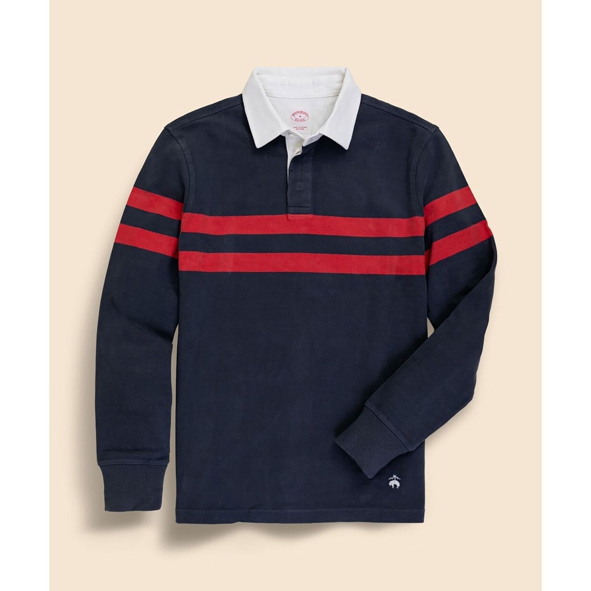 ヴィンテージ調のフェード感のある風合いが、伝統的なディテールと調和したラグビーシャツ