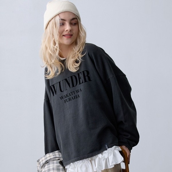 ゆったりとした着丈感と上品なフォントが大人カジュアルにぴったりなプルオーバー。