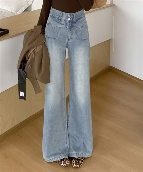 ハイウエストデニムワイドパンツ フリンジ ブルー 青 美脚 センターライン