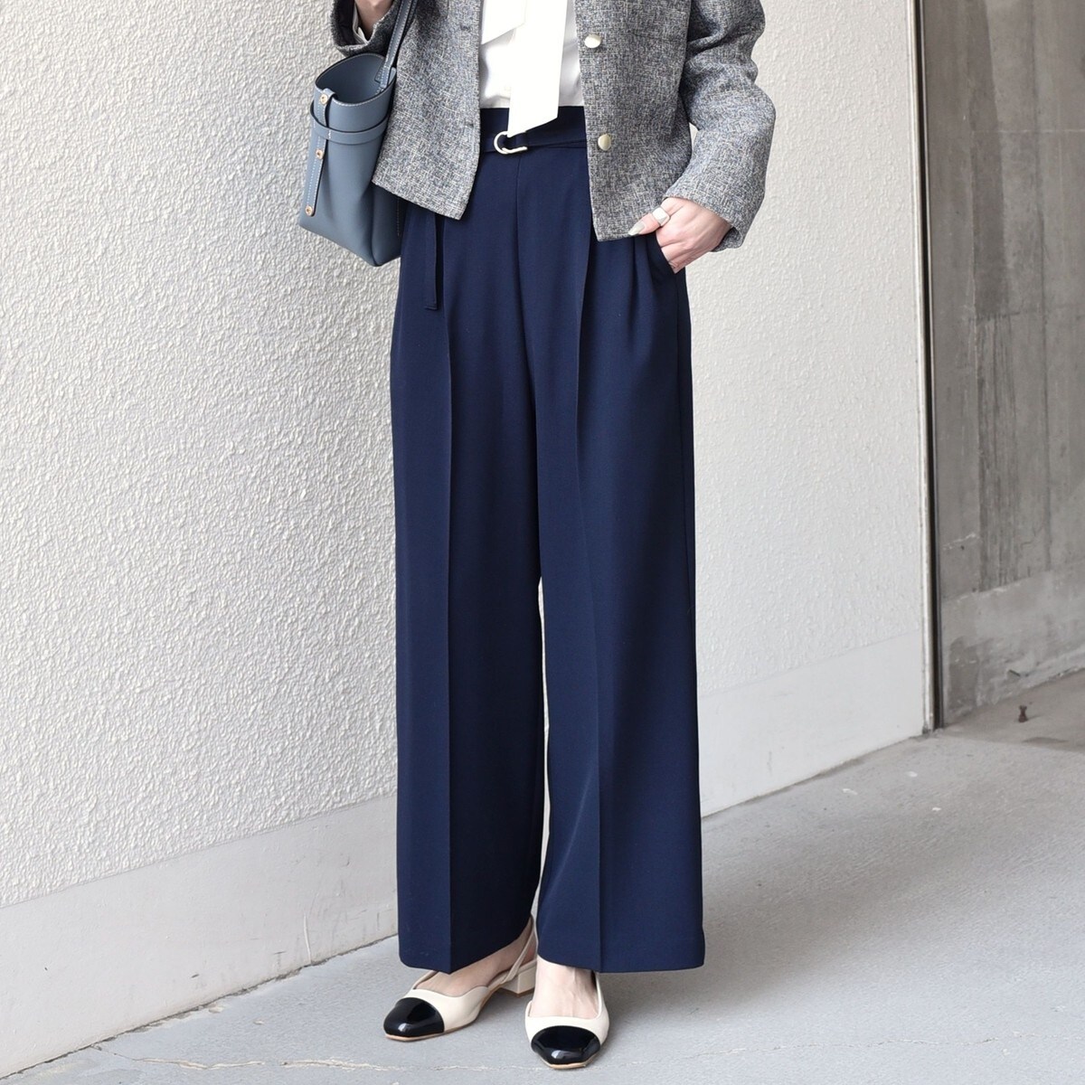 同素材のベストと合わせたセットアップスタイルは、春のオフィスカジュアルやセレモニーシーンにおすすめ。