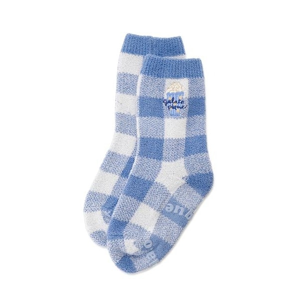 明るくHAPPYなカラーリングに、カップケーキやポップコーンのモチーフをデザインしたファミリーで楽しめるニットシリーズです。春らしいギンガムチェックの’エアリーモコ’素材を用いたKIDSサイズのソックス。ワンポイントの刺繍入りで、足裏には滑り止めも付けました。色は2色展開で、ピンクはカップケーキ、ブルーはポップコーンの絵柄が入っています。同シリーズのルームウェアとコーディネートしてお楽しみください。
