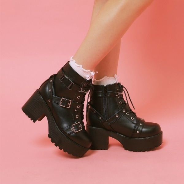 合成皮革/人工皮革 / 無地 / 7.5cm以上 / 太めヒール / ゆったり(3E~) / ラウンドトゥ / ショート(筒丈~22cm未満) / ライフスタイル / カジュアル / レースアップタイプ / 柔らかいソール / ゴム底/合成底