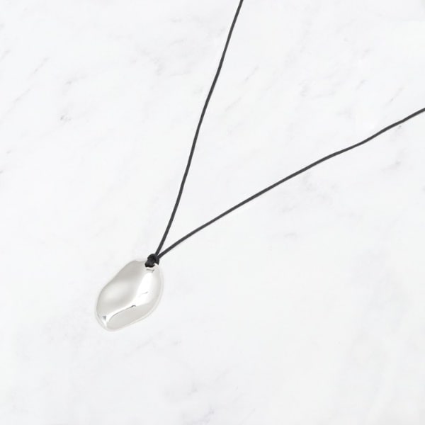 マットなサテンコードと表面に凹凸のある変形メタルパーツを組み合わせたロングネックレスです。
