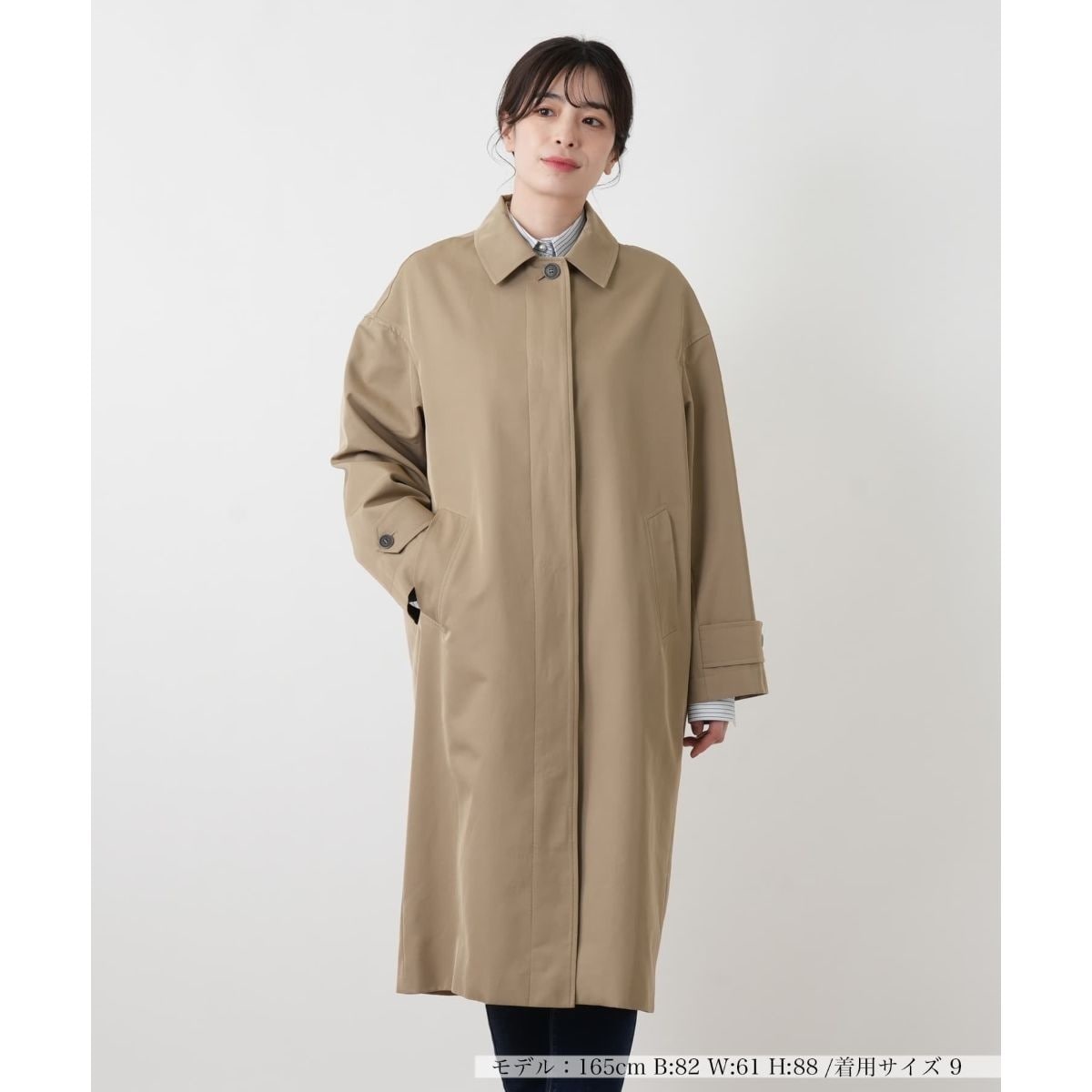 端正なステンカラーに比翼仕立てのフロントを組み合わせ、ミニマルで洗練された佇まいに仕上げたミディ丈コートです。装飾を削ぎ落としたシンプルなルックスが、素材の良さとシルエットの美しさを際立たせて大人の日常をスマートに演出。やや薄手で軽やかな風合いは、初夏の爽やかな羽織りにぴったり。フロント打ち合わせのテープや後身頃の裏地にのみあしらわれたさりげないストライプが、着脱の際やふとした瞬間に小粋なアクセントを添えてくれるこだわりを凝縮した一着です。
