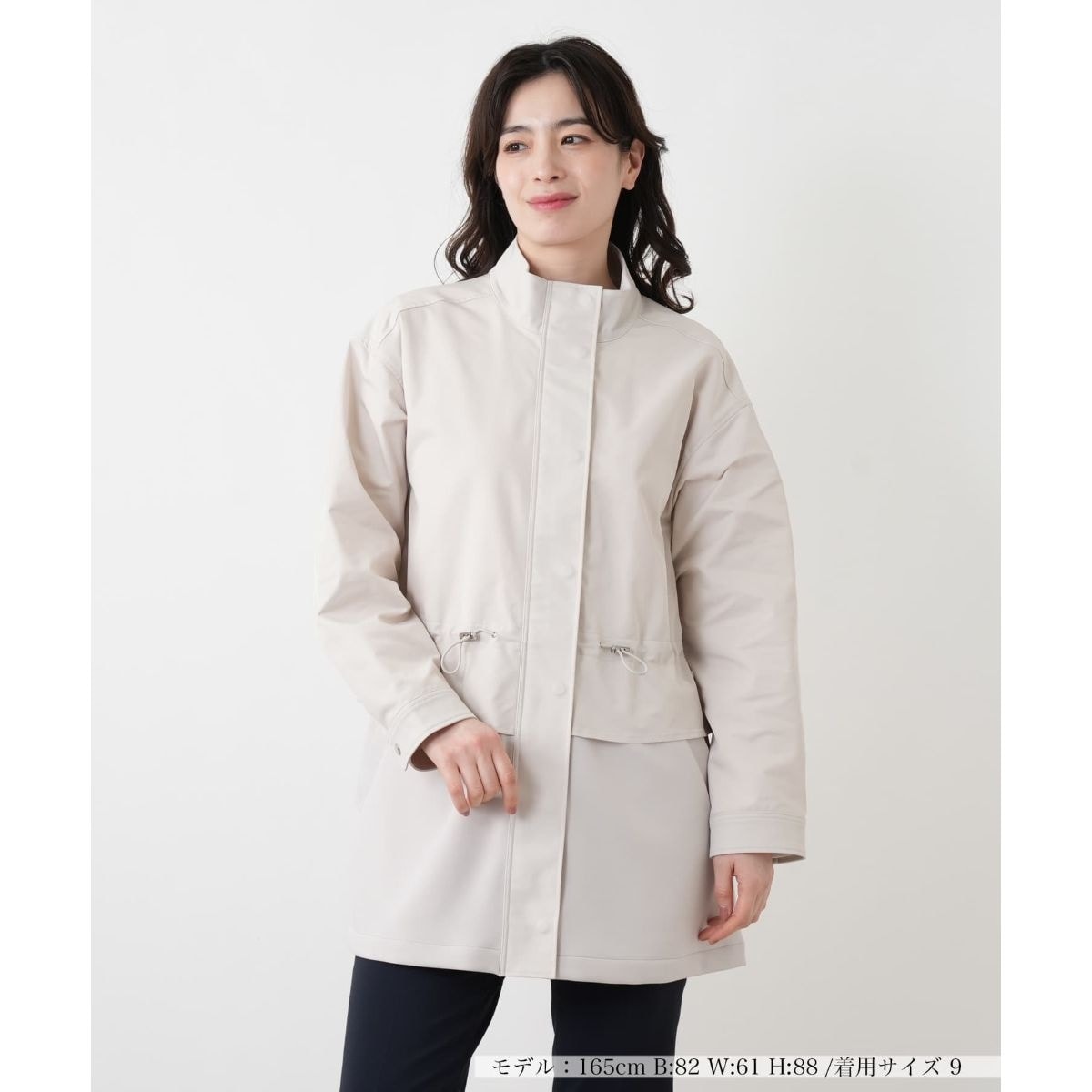 洗練されたスタンドカラーに比翼仕立てのフロントを組み合わせ、モダンで都会的な佇まいに仕上げた一着です。ショート丈のブルゾンとロングジレを重ねたような、切り替えのレイヤード風デザインが奥行きとこなれ感をもたらします。フロントウエストのドロストを絞ることでシルエットにメリハリをつけ、女性らしいアレンジも自在。軽快な春の羽織りとしてぴったりのやや薄手の生地感ながら、スナップボタンとファスナーの二重開閉仕様で機能性も備えたこだわりの光るアウターです。