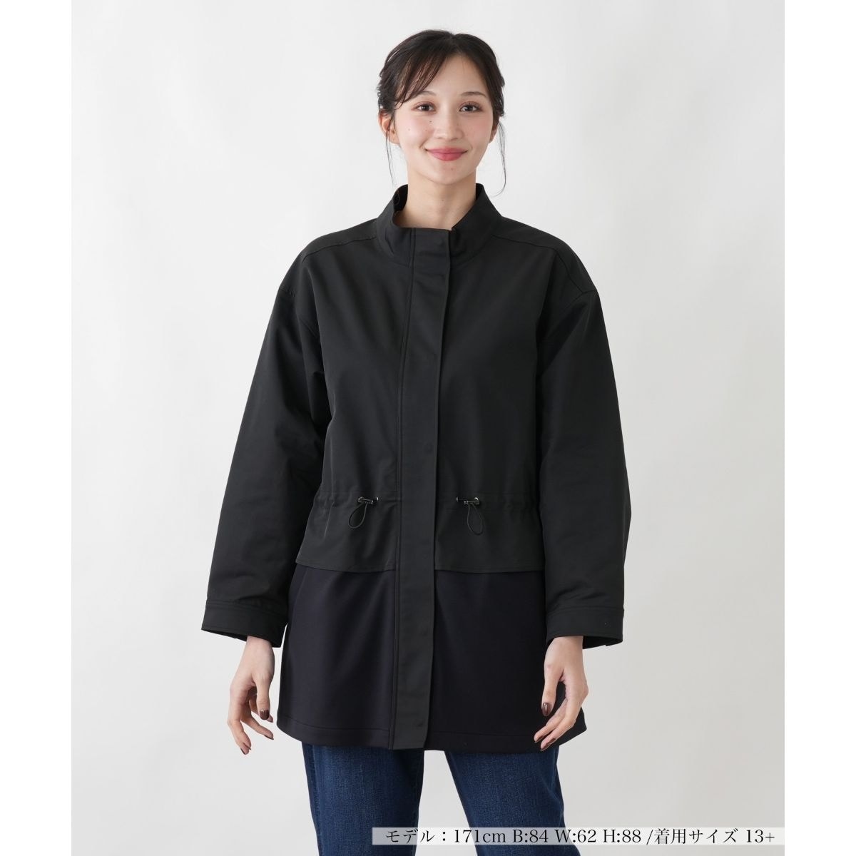 「MUSE BY ROCHAS Premiere」から、異素材の組み合わせがお洒落なカジュアルコートが登場。衿と裾部分をジャージ素材で切り替え、こなれた雰囲気を演出します。ウエストのドローストリングを絞れば、ペプラムのような女性らしいシルエットに変化。ドロップショルダーで動きやすく、さっと羽織るだけで様になるデザイン性の高い一着です。