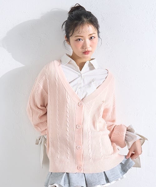 ケーブル編みVネックカーディガンとリボンスリーブのシャツのセットアイテムです。