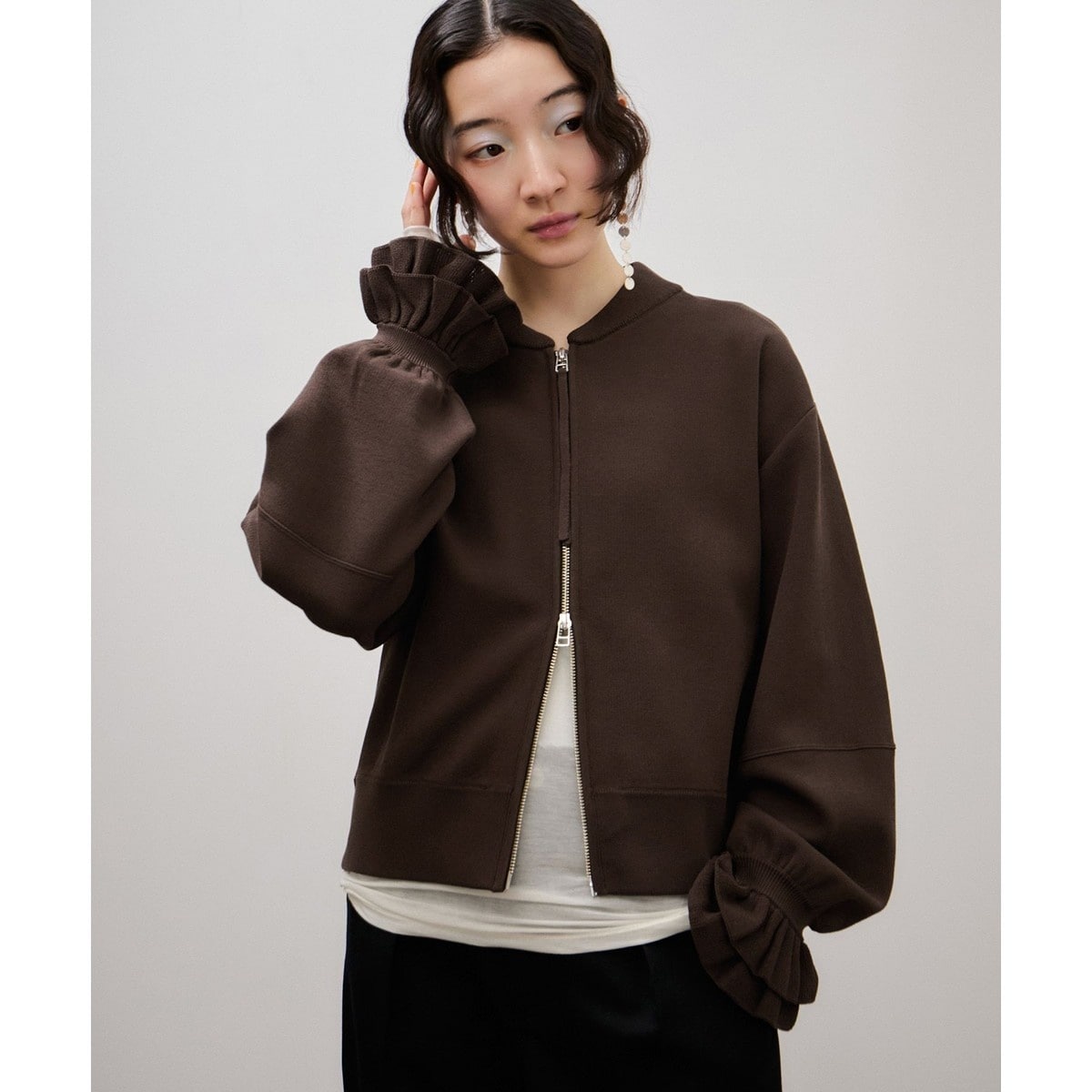 逆開ファスナーとブルゾンのような形の襟でライトアウター感覚で羽織れるアイテム。