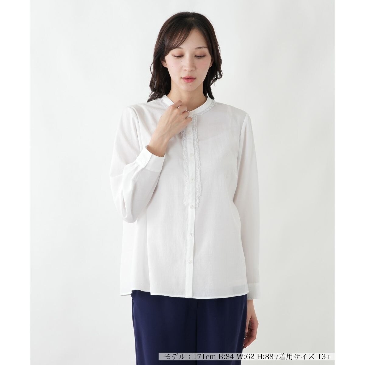 顔まわりに沿うスタンドカラーと、フロントに縦に流れるようにあしらわれたフリルが、繊細で上品な印象を与えます。細やかに波打つフリルの縁取りが、装飾に立体感と奥行きをもたらし、クラシカルな雰囲気を醸し出します。軽やかで柔らかな風合いの生地は、身体をふんわりと包み込むような、自然なシルエットを生み出します。袖口はすっきりとしたカフス仕様になっており、手元の動きを美しく見せつつ、全体の印象を引き締めるアクセントになっています