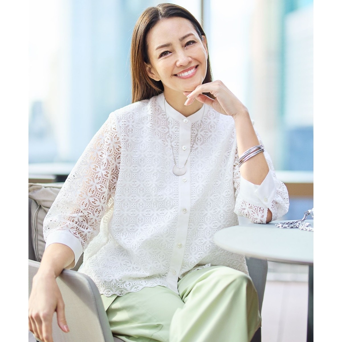 自由区ならではの繊細で上品な幾何学レースでアクセントに。ボトムを選ばず着こなせる、1枚持っておくと便利なクロップドブラウス■デザイントレンド感がありながらも短すぎない、程よいバランスのクロップド丈ブラウスです。ワイドパンツやフレアスカートなど、ボリュームのあるボトムとの相性も抜群です。レースと同色の無地生地でブロッキングすることで、程よく素材のコントラストを効かせたデザインに仕上げています。エレガントすぎない柄のレースは、シンプルなボトムに合わせるだけで華やかなコーディネートをお楽しみいただけます。■素材お花をイメージした幾何柄のレース生地です。刺繍の技法を用いて、繊細でほどよい膨らみを持たせた、高級感のある透かし模様に仕上げています。絹のような風合いのポリエステル糸を使用しているため、さらりと快適な着心地です。