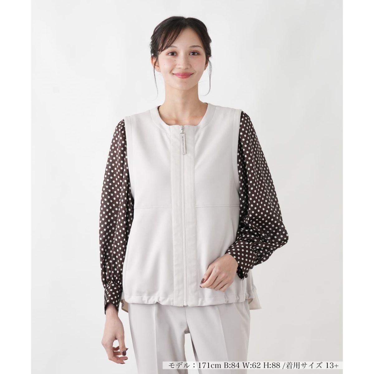 ジャージと布帛の異素材コンビネーションが「MUSE」らしい、洗練されたデザインのベスト。裾の内側を絞ることでシルエットに変化をつけられ、着こなしの幅が広がります。ファスナースライダーにあしらわれたロゴ入りのグログランテープもさりげないアクセントに。いつものコーディネートにプラスするだけで、ぐっとお洒落な印象になります。