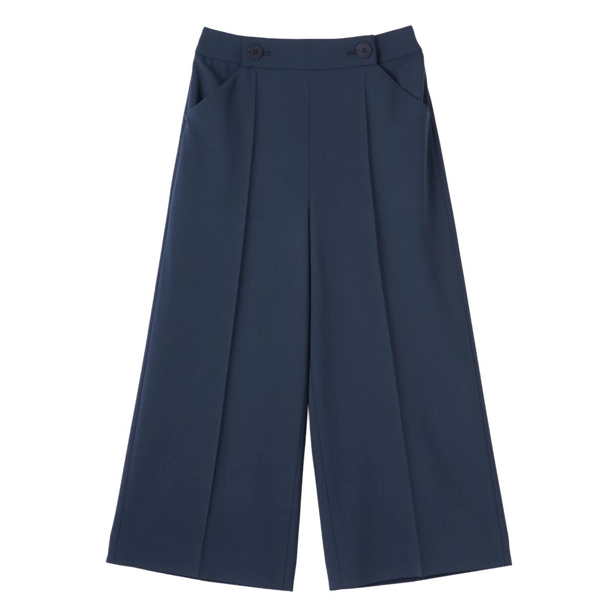 センタープレスを効かせた、すとんと落ちるワイドシルエット。前身頃にボタンを2つ並べたマニッシュなウエストは、新鮮な印象とともにタックインスタイルも洗練された雰囲気に。モダンな品格を添える一本です。