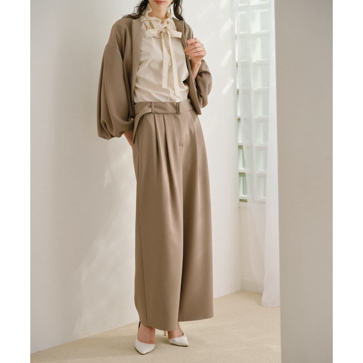 共布のベルトがウエストラインを引き締め、端正な佇まいを演出するワイドパンツです。フロントに施されたタックがアクセントになり、裾に向かってすとんと落ちるストレートシルエットが脚長見せ効果を発揮。バックウエストはゴム仕様となっているため、リラックスした穿き心地ながらも、タックインした際のフロントはすっきりと美しく決まります。初夏の爽やかな空気によく馴染み、オフィスから休日のお出かけまで、幅広いシーンに洗練された品格を添えてくれる一本です。