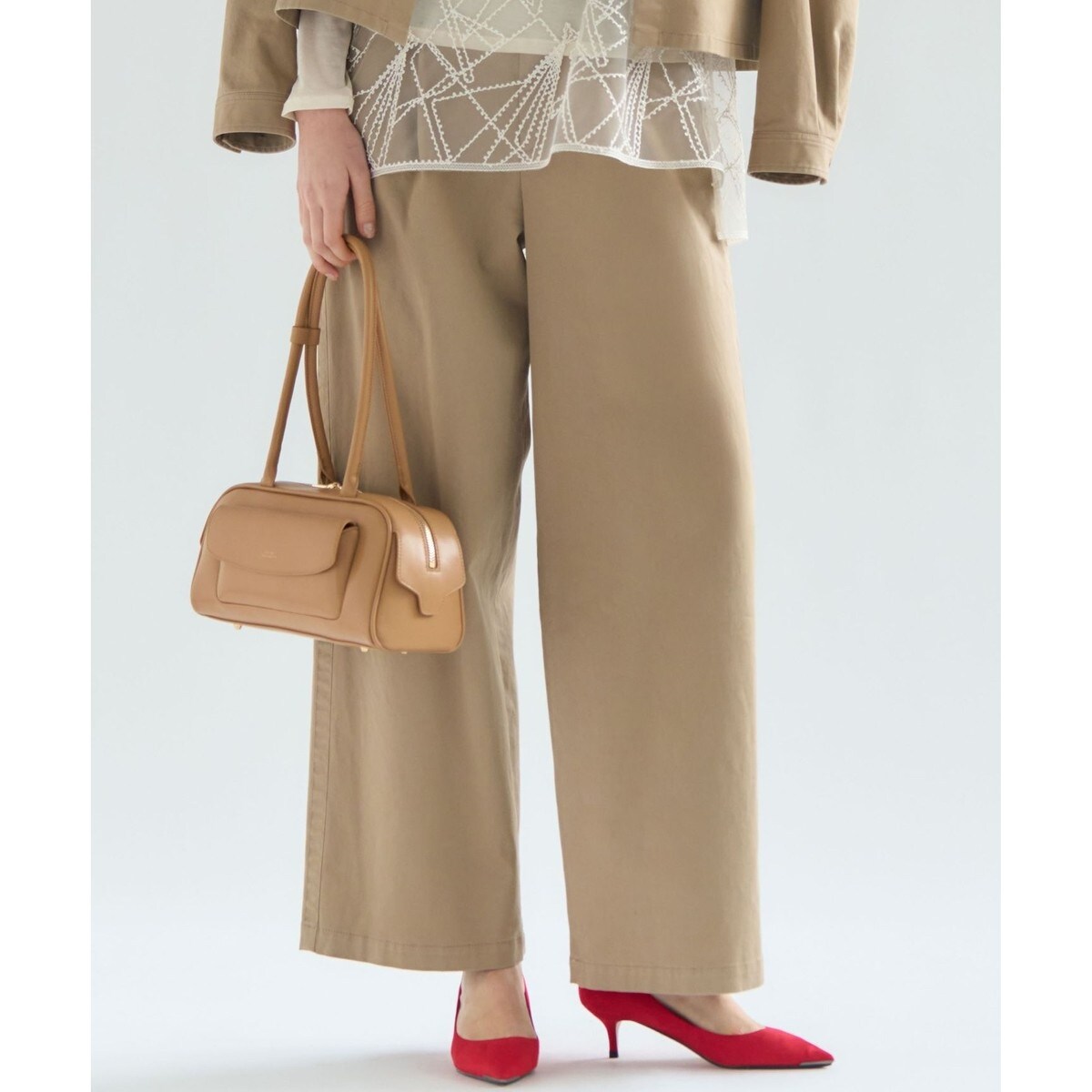 ■デザインストレッチの効いたギャバジン素材で仕立てた、リラックス感ときちんと感を兼ね備えたチノワイドパンツです。絶妙なワイドシルエットで、すっきりとしたシルエットになっています。 ウエストベルトのサイドにはタブとボタンをあしらっており、お好みで調節が可能。 カットソーをタックインしてすっきりと着こなしたり、シャツを合わせてシャープにまとめたりと、合わせるトップスを選びません。足元にパンプスを合わせれば通勤スタイルに、フラットシューズなら休日のカジュアルスタイルにと、幅広いシーンで活躍します。カラーは、肌なじみが良く、女性らしい柔らかさを演出するベージュ(#033)の1色展開です。