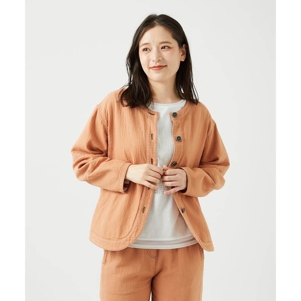 体のラインを拾いにくい、ゆったりとしたサイズ感は、インナーを選ばず、季節の変わり目にも重宝します。洗い加工による自然な風合いと、ジャンニロならではの特別なカラーが魅力で、他にはない一着として長くお楽しみいただけます。同素材のボトム[NGLEF15270]と合わせて、セットアップ風の着こなしもおすすめです。また、同素材のロング丈ブラウス[NGBEF15390]、フード付きブルゾン[NGDEF16390]、ジレ[NGDEF15330]もございます。