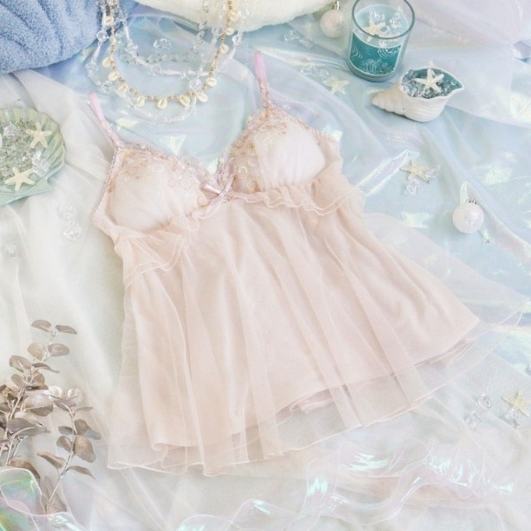 カップがついたタイプのキャミソールなので、ブラジャーを着けずにこれ1枚でご着用いただけます。身生地はソフトチュール素材を使用しており、さらりとした気持ちの良い着心地です。