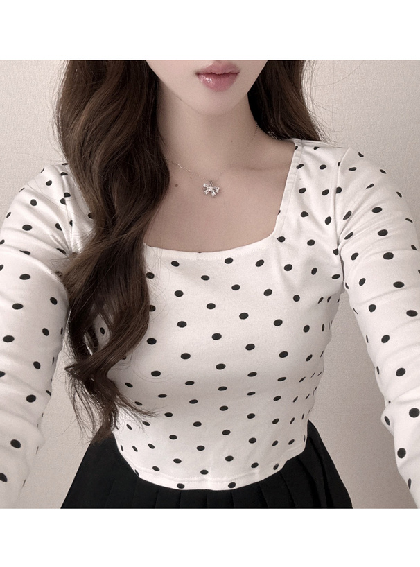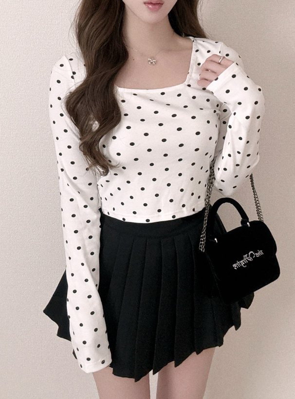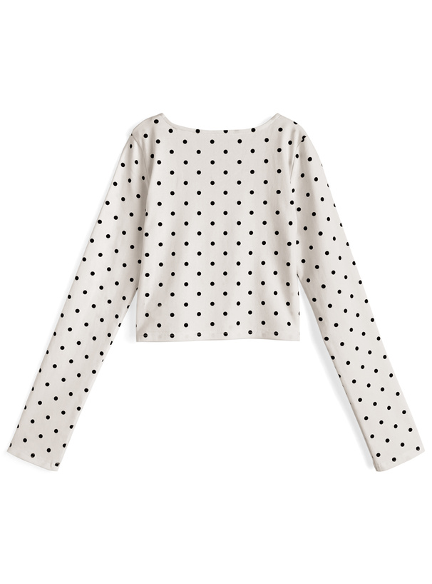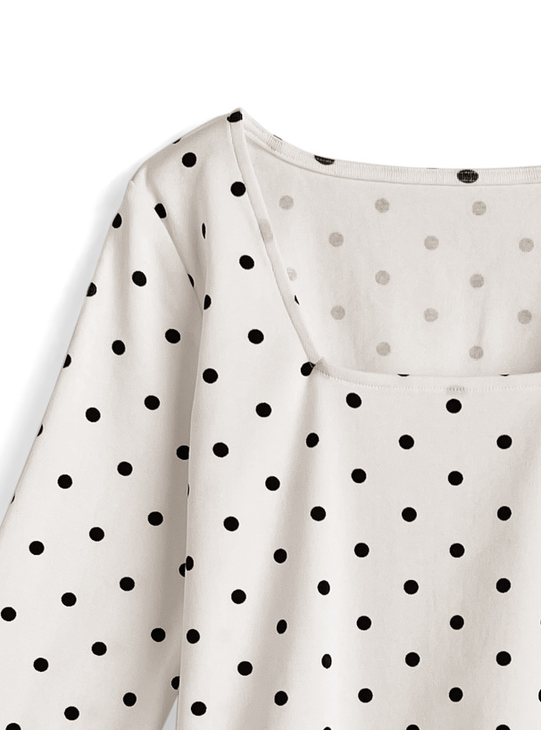 クラシカルな水玉柄プリントをあしらったショート丈のロングTシャツ。