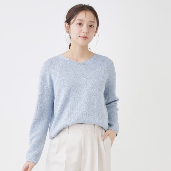 【まとめ買いセール中!】水色ラメ入りVネック ケーブル編み ニット